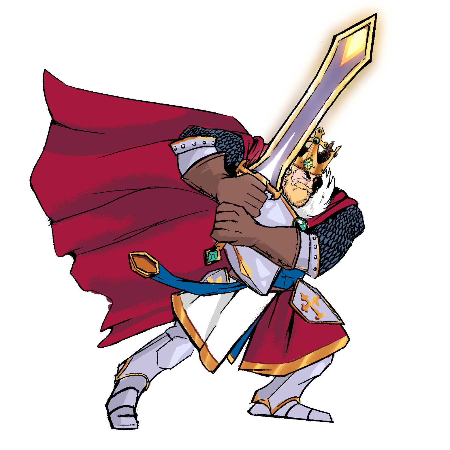 As wide as he is tall, King Artur is an imposing figure but also a kind ruler. His stature and giant sword speak volumes of his strength, but he also smiles and frowns with his mustache for that fatherly vibe that should come from a wise, noble king.