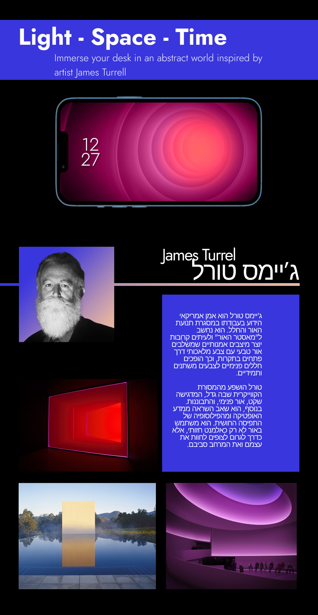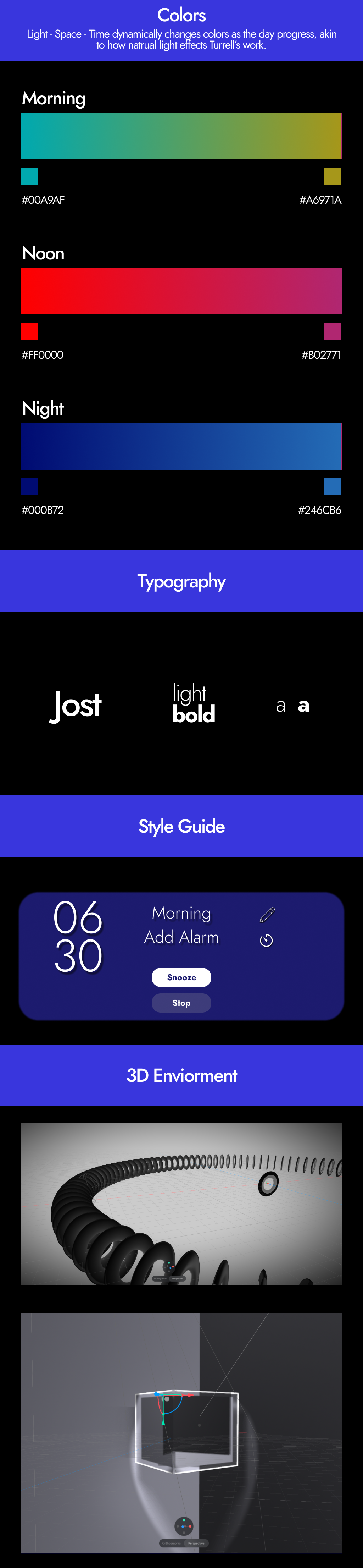 Light-Space-Time was a university assignment (get used to seeing a lot of these) in which I was instructed to pick an artist and design an app inspired by their work. Being cheeky, I chose a clock app and the artist/architect James Turrel due to his minimalistic approach and stunning work with natural light and large, liminal spaces.